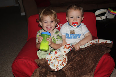 After baths we put Nemo on for the kids and Cooper and Hudson shared Coop's big, red chair. Cooper is 6 months older than Hudson and they play great together!